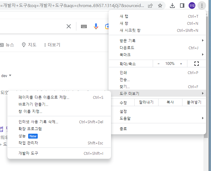 (1) 우측 상단 설정(세로 점 3개) 클릭 - 도구 더보기 - 개발자 도구 선택