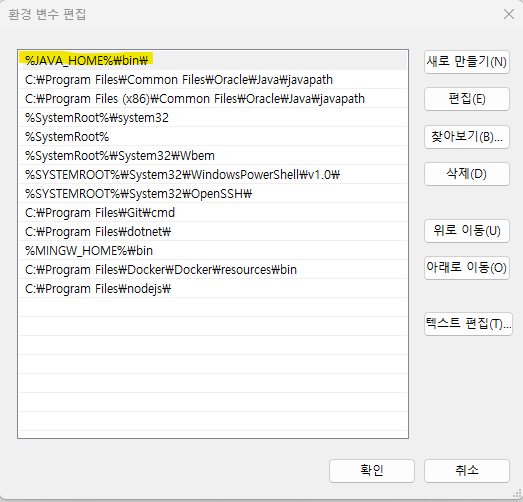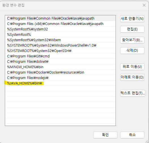 편집 버튼을 누르면 아래와 같이 뜬다. 새로 만들기를 눌러, %JAVA_HOME%\bin\ 를 추가한다.