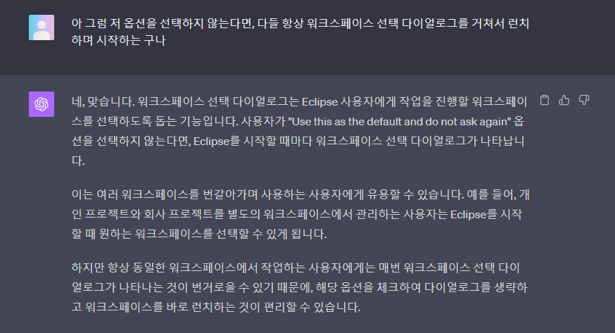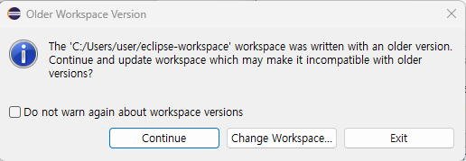 참고로 난, 이전에 다른 버전에 이클립스를 깔았다가(참고자료 이전 티스토리 게시글 참고) 깔끔하지 않게 삭제했던 적이 있어서 위와 같은 알림이 떴다.