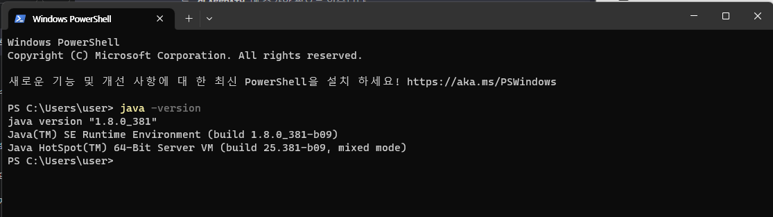 앞서 설치했던 JAVA SE 1.8.0_381 버전이 잘 나타나는 것을 확인할 수 있다.