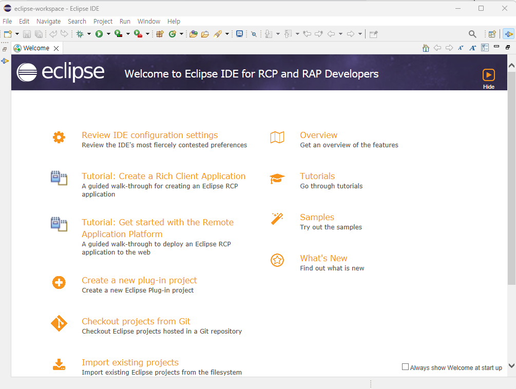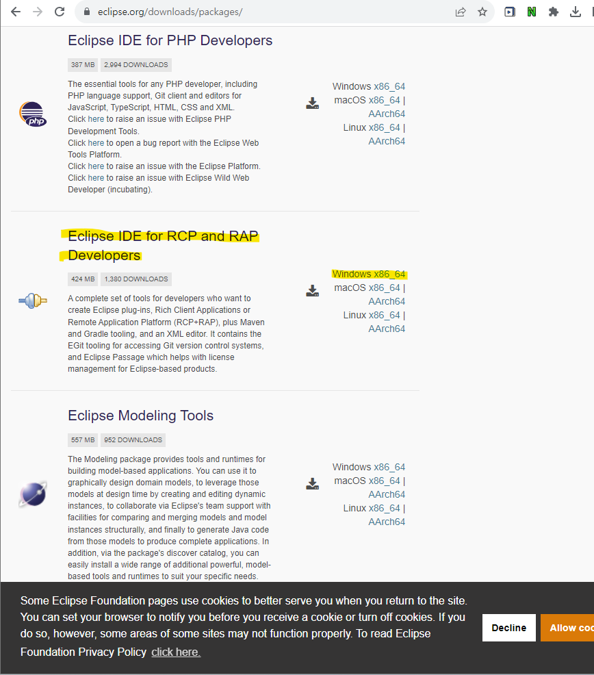 • Download and install Eclipse at https://www.eclipse.org/downloads/packages/. Be sure you download the Eclipse for RCP and RAP Developers. Download the right version for your platform.