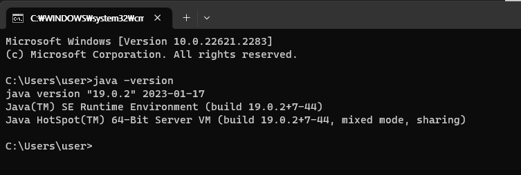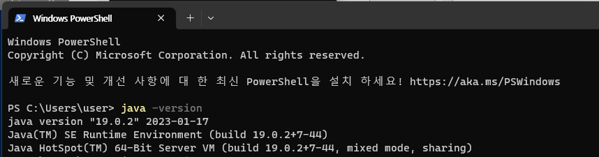 cmd에서 java -version을 치면, 이전에 다운받은 jdk-19 때문에, 아래와 같이 뜬다.