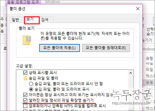 ▼ 폴더 옵션 대화상자가 뜨면 보기 탭으로 갑니다. 화면에 [고급 설정] 목록에서 [알려진 파일 형식의 파일 확장명 숨기기] 를 체크 해제 합니다. 윈도우7 에서도 동일한 방식으로 옵션을 변경했었습니다.