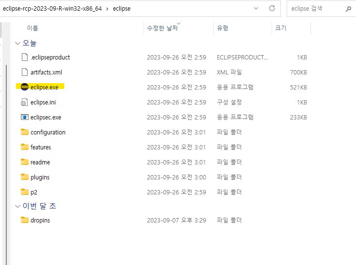 그리고 eclipse.exe를 실행한다. (참고로 파일 확장자명이 표시되지 않을 때는 https://mainia.tistory.com/5104 이 링크에 있는 방식처럼 파일 확장자를 표시하면 된다.)