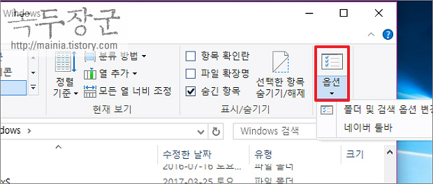 ▼ [보기] 탭에서 오른쪽 끝으로 가면 [옵션] 리본 메뉴가 있습니다. 상단 아이콘을 클릭하거나 하위 메뉴인 [옵션] > [폴더 및 검색 옵션] 변경을 선택합니다.