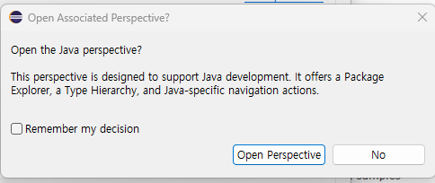 finish를 누르니 아래와 같은 창이 떠서, open perspective를 선택했다.